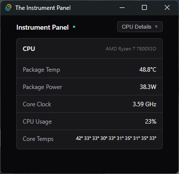 - CPU metrics including package temperature, power draw, clock speed, and per-core temperatures