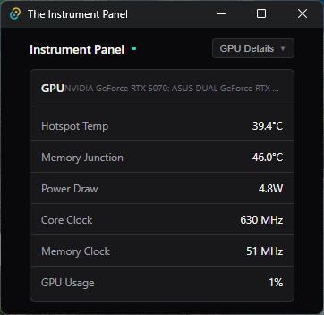 - GPU monitoring for hotspot temperature, memory junction, VRAM usage, and fan speed