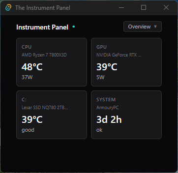 A lightweight desktop hardware monitoring application built with Tauri 2, React 19, and Rust that displays real-time CPU, GPU, storage, and system metrics.